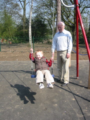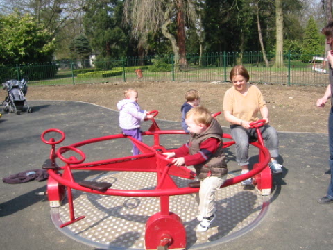 New rides at South Park. On the roundabout with Maddie, Conall and Auntie Jill, and on the swing with Conall's grandad.